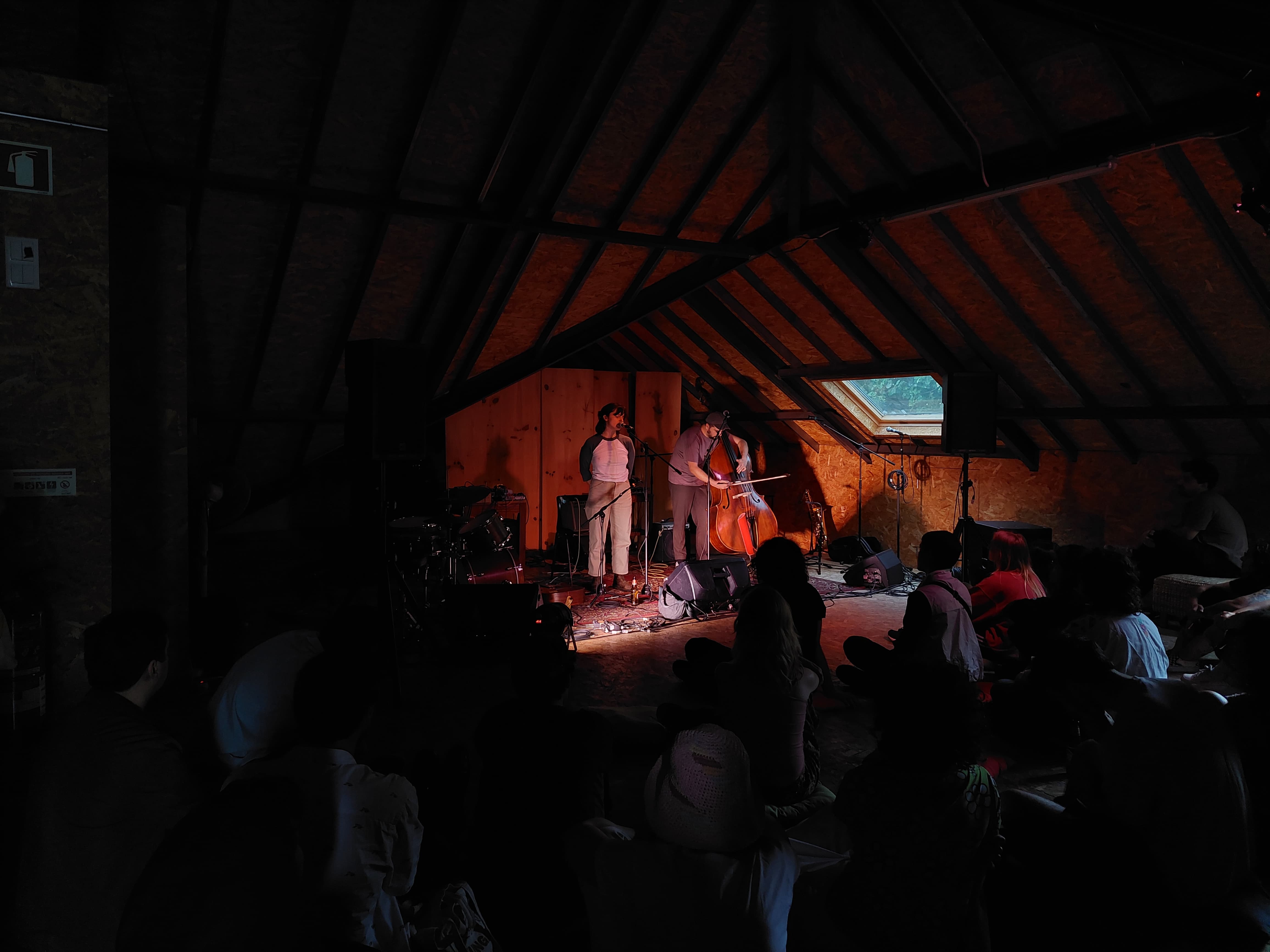 A programação estava dividida entre a tarde no sótão e a noite no salão. Sempre pontuais, os concertos começaram pouco depois das 17h e só viriam a acabar no dia seguinte. No sótão, uma carpete demarcava o palco; à sua frente, espalhavam-se almofadas e espaços para sentar. Foi neste ambiente de cores quentes e silêncio respeitoso que começaram a ecoar as fortes canções de luta da Chica, cuja voz era acompanhada pelo contrabaixo de Bá Alvares, um registo a que já fomos habituados e do qual nunca nos cansamos. Os Scorpions do Barreiro seguiram-se no alinhamento, num improviso contínuo de maracas e sintetizadores, sem linha orientadora aparente e produtivo no seu próprio caos, numa mistura entre analógico e eletrónico para uma exploração de texturas sonoras. O hyperpop sobre dores de crescimento e corações partidos do quarteto Bejaflor x MC Falcona x Vert Gum x Carolina Miragaia, que tocou em nome do coletivo Æ, fez o último concerto da tarde.