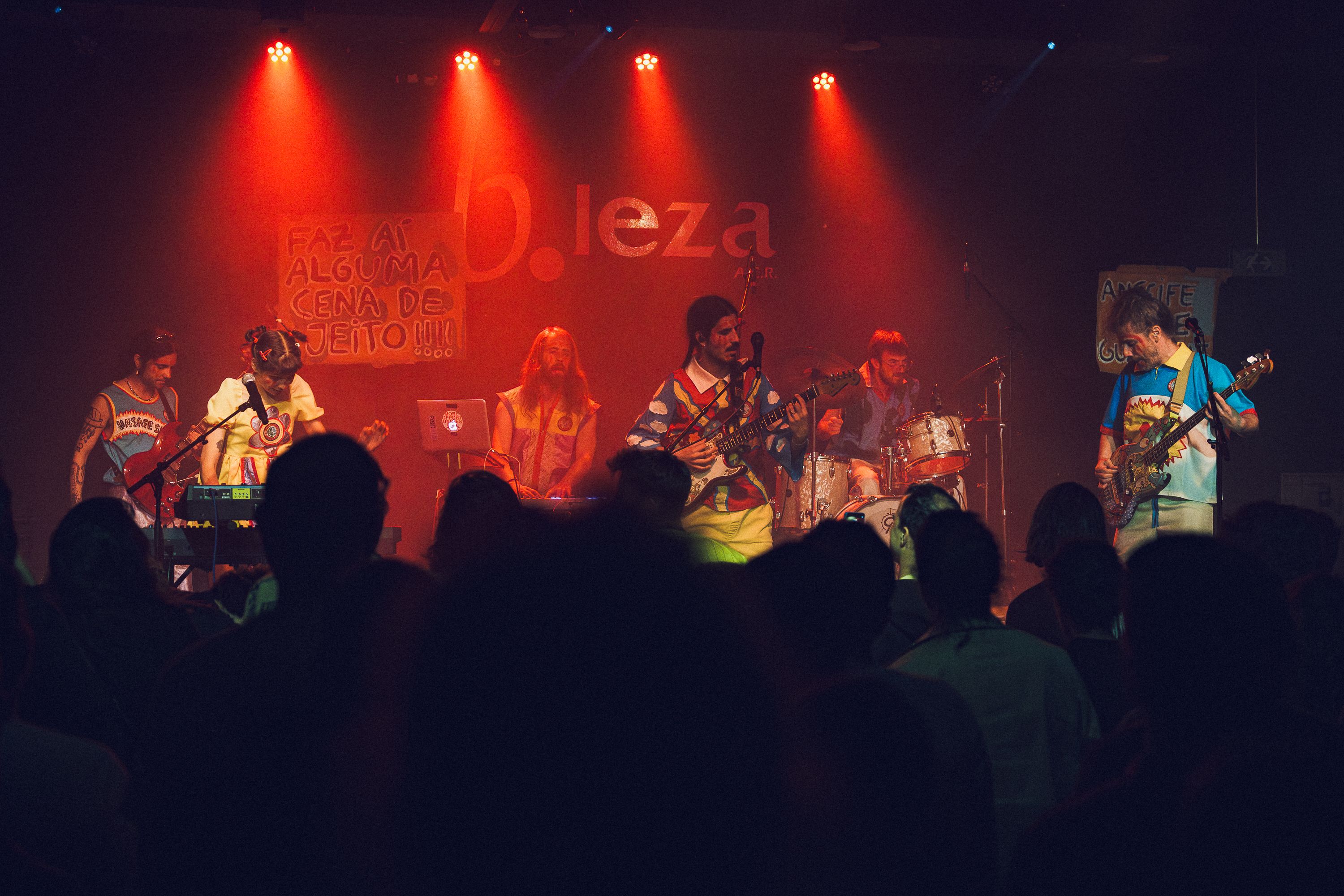 Antes de o concerto começar, os presentes já conseguiam ter um gostinho do que aí vinha, apenas lendo os cartazes espalhados pelo palco: “se calhar viemos todos do mesmo sítio”, “faz aí alguma cena de jeito”… E eles fizeram. A banda/coletivo, composta por seis músicos — Alexandra Saldanha (voz e teclas), Nuno Duarte (guitarra e voz), Filipe Louro (baixo), José Vale (guitarra), João Cardita (bateria) e Diogo Costa (teclas e backing tracks) — apresenta-se de uma forma visualmente muito peculiar: roupas inventadas, pinturas na cara e cabelos raros. E é impossível não destacar a presença de Alexandra Cuecas, cuja presença em palco é magnética e da qual, confesso, saí ligeiramente enamorada.